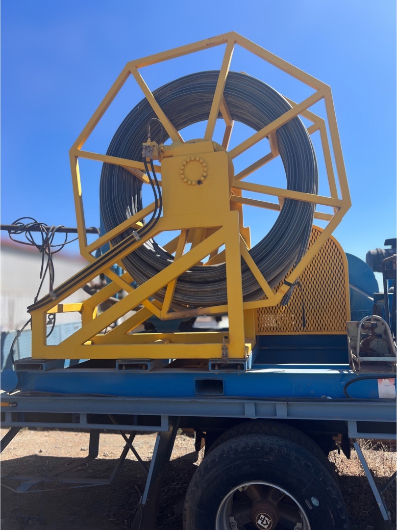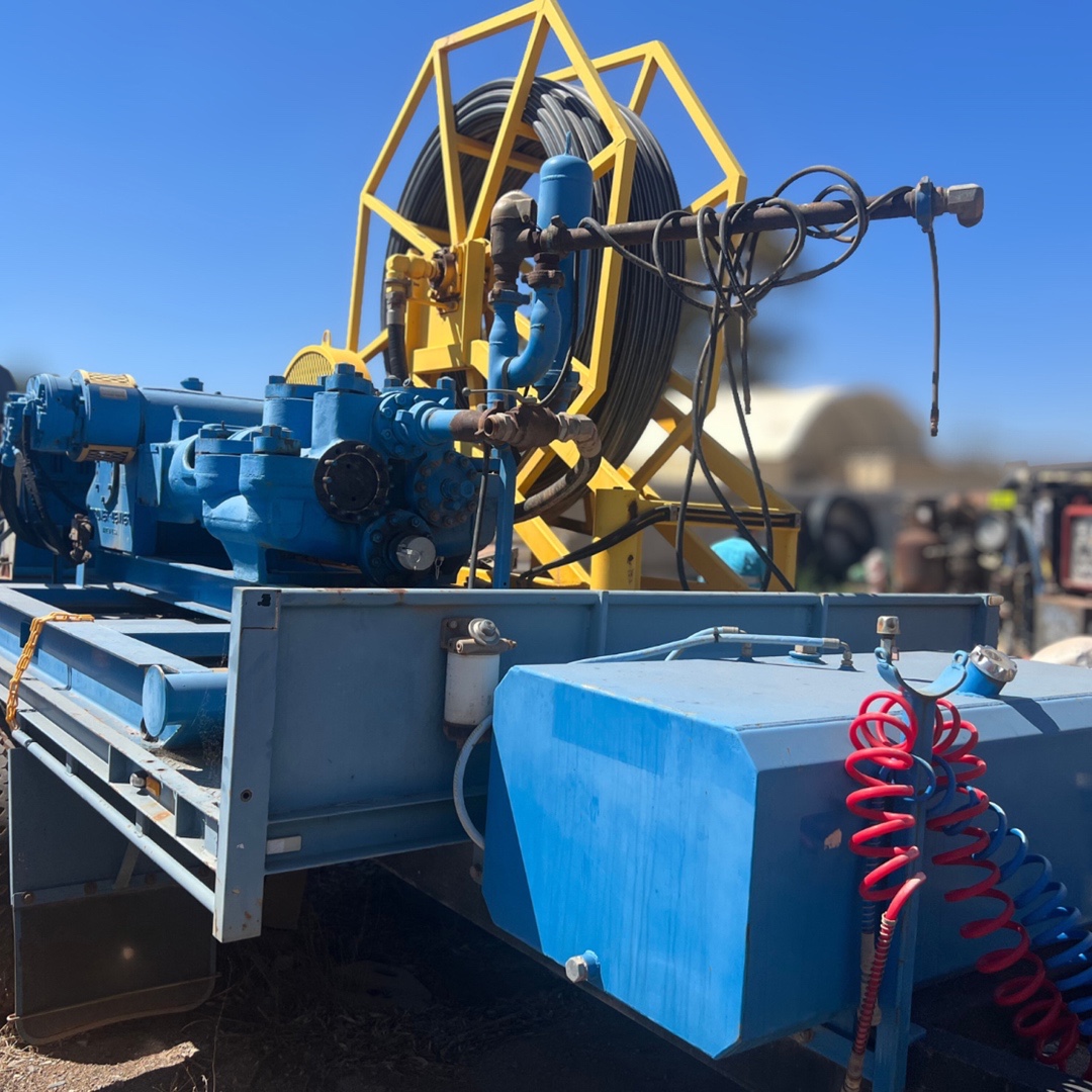 Gardner Denver FXX 172 5×8 duplex pump Powered by a Duetz BF6L914 air cooled diesel 6.5L – 155 hp @ 2300 Rpm Hydraulic drive to the pump Large hydraulically driven hose reeler for poly pipe for grouting Mounted on a single axle pig trailer.